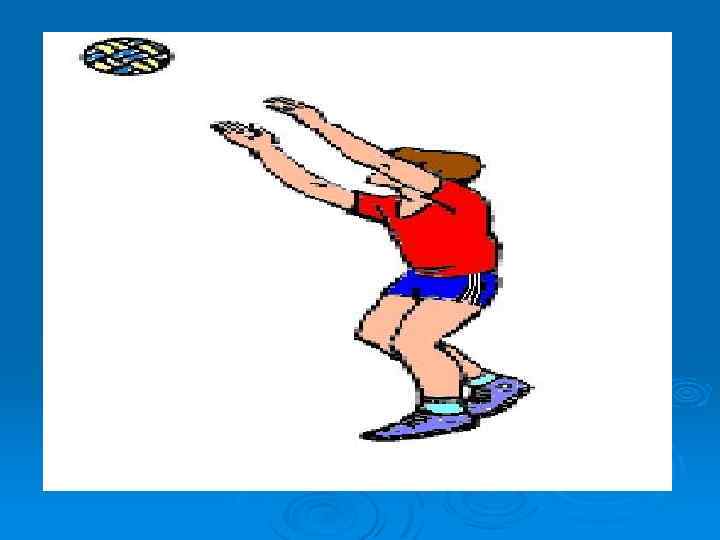 Прием мяча двумя руками снизу. Ноги согнуты, одна впереди. Руки прямые, развернуты немного наружу, кисти сомкнуты и опущены вниз. Прием мяча производится на нижнюю часть предплечий, руки в локтевых суставах прямые (не сгибать!). Нет большого встречного движения, руки чуть-чуть приближаются к мячу. Передача мяча осуществляется за счет небольшого разгибания ног и направляющего движения руками.