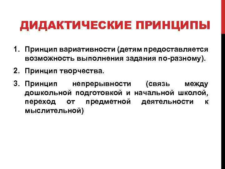ДИДАКТИЧЕСКИЕ ПРИНЦИПЫ 1. Принцип вариативности (детям предоставляется возможность выполнения задания по-разному). 2. Принцип творчества. 3. Принцип непрерывности (связь между дошкольной подготовкой и начальной школой, переход от предметной деятельности к мыслительной)