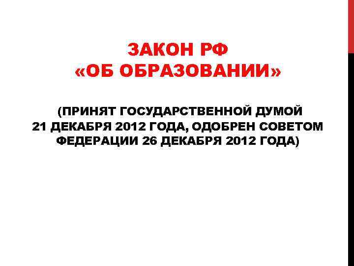 ЗАКОН РФ «ОБ ОБРАЗОВАНИИ» (ПРИНЯТ ГОСУДАРСТВЕННОЙ ДУМОЙ 21 ДЕКАБРЯ 2012 ГОДА, ОДОБРЕН СОВЕТОМ ФЕДЕРАЦИИ 26 ДЕКАБРЯ 2012 ГОДА)