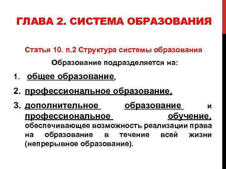 ГЛАВА 2. СИСТЕМА ОБРАЗОВАНИЯ Статья 10. п. 2 Структура системы образования Образование подразделяется на: 1. общее образование, 2. профессиональное образование, 3. дополнительное профессиональное образование и обучение, обеспечивающее возможность реализации права на образование в течение всей жизни (непрерывное образование).