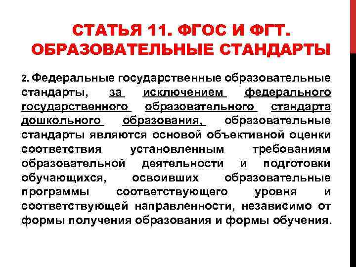 СТАТЬЯ 11. ФГОС И ФГТ. ОБРАЗОВАТЕЛЬНЫЕ СТАНДАРТЫ 2. Федеральные государственные образовательные стандарты, за исключением федерального государственного образовательного стандарта дошкольного образования, образовательные стандарты являются основой объективной оценки соответствия установленным требованиям образовательной деятельности и подготовки обучающихся, освоивших образовательные программы соответствующего уровня и соответствующей направленности, независимо от формы получения образования и формы обучения.