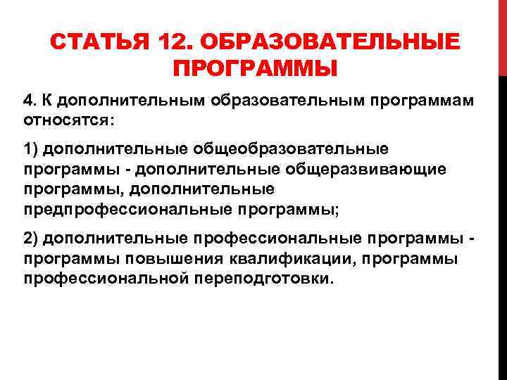 СТАТЬЯ 12. ОБРАЗОВАТЕЛЬНЫЕ ПРОГРАММЫ 4. К дополнительным образовательным программам относятся: 1) дополнительные общеобразовательные программы - дополнительные общеразвивающие программы, дополнительные предпрофессиональные программы; 2) дополнительные профессиональные программы - программы повышения квалификации, программы профессиональной переподготовки.