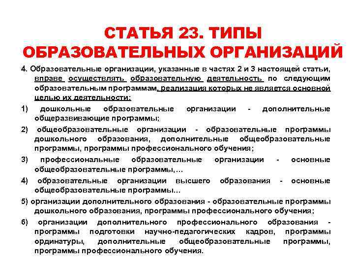 СТАТЬЯ 23. ТИПЫ ОБРАЗОВАТЕЛЬНЫХ ОРГАНИЗАЦИЙ 4. Образовательные организации, указанные в частях 2 и 3 настоящей статьи, вправе осуществлять образовательную деятельность по следующим образовательным программам, реализация которых не является основной целью их деятельности: 1) дошкольные образовательные организации - дополнительные общеразвивающие программы; 2) общеобразовательные организации - образовательные программы дошкольного образования, дополнительные общеобразовательные программы, программы профессионального обучения; 3) профессиональные образовательные организации - основные общеобразовательные программы, … 4) образовательные организации высшего образования - основные общеобразовательные программы… 5) организации дополнительного образования - образовательные программы дошкольного образования, программы профессионального обучения; 6) организации дополнительного профессионального образования - программы подготовки научно-педагогических кадров, программы ординатуры, дополнительные общеобразовательные программы, программы профессионального обучения.