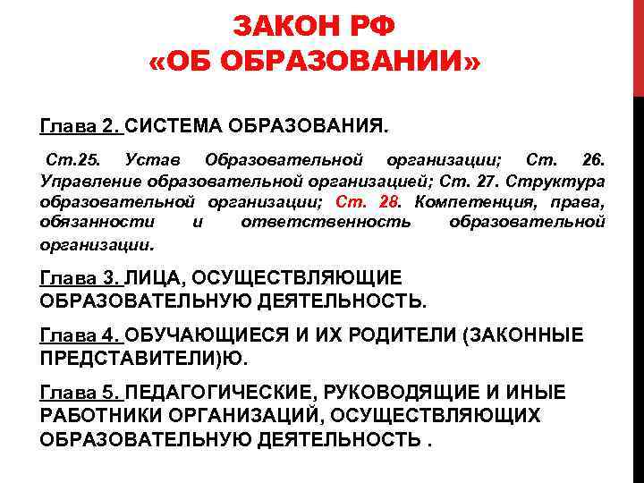 ЗАКОН РФ «ОБ ОБРАЗОВАНИИ» Глава 2. СИСТЕМА ОБРАЗОВАНИЯ. Ст. 25. Устав Образовательной организации; Ст. 26. Управление образовательной организацией; Ст. 27. Структура образовательной организации; Ст. 28. Компетенция, права, обязанности и ответственность образовательной организации. Глава 3. ЛИЦА, ОСУЩЕСТВЛЯЮЩИЕ ОБРАЗОВАТЕЛЬНУЮ ДЕЯТЕЛЬНОСТЬ. Глава 4. ОБУЧАЮЩИЕСЯ И ИХ РОДИТЕЛИ (ЗАКОННЫЕ ПРЕДСТАВИТЕЛИ)Ю. Глава 5. ПЕДАГОГИЧЕСКИЕ, РУКОВОДЯЩИЕ И ИНЫЕ РАБОТНИКИ ОРГАНИЗАЦИЙ, ОСУЩЕСТВЛЯЮЩИХ ОБРАЗОВАТЕЛЬНУЮ ДЕЯТЕЛЬНОСТЬ.