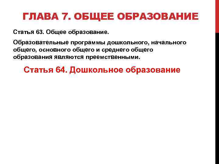 ГЛАВА 7. ОБЩЕЕ ОБРАЗОВАНИЕ Статья 63. Общее образование. Образовательные программы дошкольного, начального общего, основного общего и среднего общего образования являются преемственными. Статья 64. Дошкольное образование