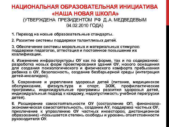 НАЦИОНАЛЬНАЯ ОБРАЗОВАТЕЛЬНАЯ ИНИЦИАТИВА «НАША НОВАЯ ШКОЛА» (УТВЕРЖДЕНА ПРЕЗИДЕНТОМ РФ Д. . А. МЕДВЕДЕВЫМ 04. 02. 2010 ГОДА) 1. Переход на новые образовательные стандарты. 2. Развитие системы поддержки талантливых детей. 3. Обеспечение системы моральных и материальных стимулов поддержки педагогов, аттестация и постоянное повышение их квалификации. 4. Изменение инфраструктуры ОУ как по форме, так и по содержанию: разработка новых форм проектирования зданий ОУ, нового оснащения для создания психологического и физического комфорта пребывания ребенка в ОУ, безопасность, создание безбарьерной среды (интеграция детей-инвалидов). 5. Сохранение и укрепление здоровья детей (питание, медицинское обслуживание, физкультура и спорт, ЗОЖ, профилактические программы, индивидуальные программы развития здоровья детей, индивидуальный подход к каждому, недопустимость учебной перегрузки детей). 6. Расширение самостоятельности ОУ (составление ОП, финансовоэкономическая самостоятельность, создание АУ, поддержка частных ОУ, привлечение к управлению ОУ частных инвесторов, дистанционное образование) –повышается степень свободы и уровень ответственности руководителя ОУ.