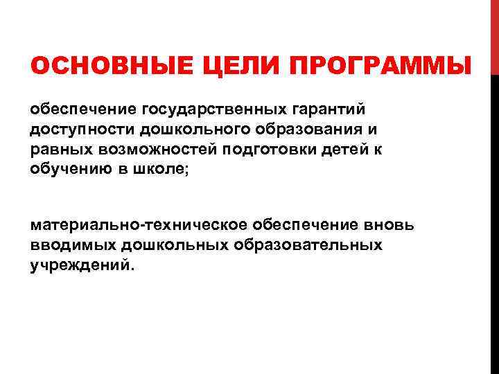 ОСНОВНЫЕ ЦЕЛИ ПРОГРАММЫ обеспечение государственных гарантий доступности дошкольного образования и равных возможностей подготовки детей к обучению в школе; материально-техническое обеспечение вновь вводимых дошкольных образовательных учреждений.