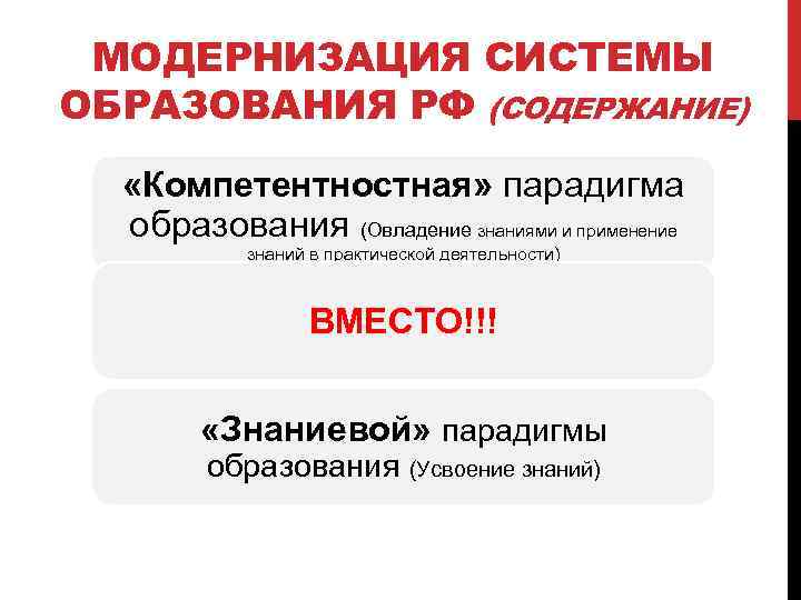 МОДЕРНИЗАЦИЯ СИСТЕМЫ ОБРАЗОВАНИЯ РФ (СОДЕРЖАНИЕ) «Компетентностная» парадигма образования (Овладение знаниями и применение знаний в практической деятельности) ВМЕСТО!!! «Знаниевой» парадигмы образования (Усвоение знаний)