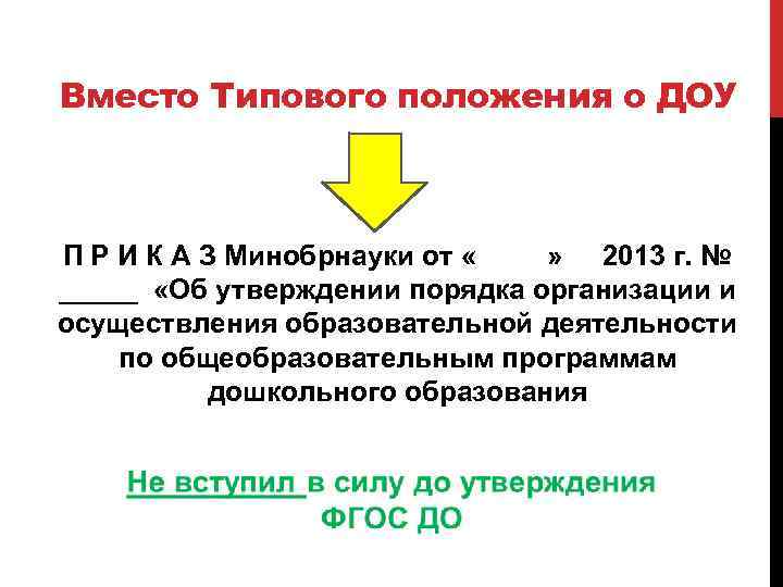 Вместо Типового положения о ДОУ П Р И К А З Минобрнауки от « » 2013 г. № _____ «Об утверждении порядка организации и осуществления образовательной деятельности по общеобразовательным программам дошкольного образования