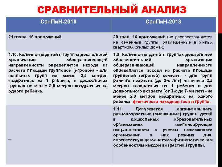 СРАВНИТЕЛЬНЫЙ АНАЛИЗ Сан. Пи. Н-2010 Сан. Пи. Н-2013 21 глава, 16 приложений 20 глав, 16 приложений (не распространяются на семейные группы, размещенные в жилых квартирах (жилых домах) 1. 10. Количество детей в группах дошкольной организации общеразвивающей направленности определяется исходя из расчета площади групповой (игровой) - для ясельных групп не менее 2, 5 метров квадратных на 1 ребенка, в дошкольных группах не менее 2, 0 метров квадратных на одного ребенка. 1. 9. Количество детей в группах дошкольной образовательной организации общеразвивающей направленности определяется исходя из расчета площади групповой (игровой) комнаты - для групп раннего возраста (до 3 -х лет) не менее 2, 5 метров квадратных на 1 ребенка и для дошкольного возраста (от 3 -х до 7 -ми лет) - не менее 2, 0 метров квадратных на одного ребенка, фактически находящегося в группе. _ 1. 11 Допускается организовывать разновозрастные (смешанные) группы детей в дошкольных образовательных организациях компенсирующей направленности с учетом возможности организации в них режима дня, соответствующего натомо-физиологическим а особенностям каждой возрастной группы.