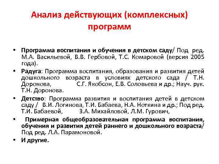 Анализ действующих (комплексных) программ • Программа воспитания и обучения в детском саду/ Под ред. М. А. Васильевой, В. В. Гербовой, Т. С. Комаровой (версия 2005 года). • Радуга: Программа воспитания, образования и развития детей дошкольного возраста в условиях детского сада / Т. Н. Доронова, С. Г. Якобсон, Е. В. Соловьева и др. ; Науч. рук. Т. Н. Доронова. • Детство: Программа развития и воспитания детей в детском саду / В. И. Логинова, Т. И. Бабаева, Н. А. Ноткина и др. ; Под ред. Т. И. Бабаевой, З. А. Михайловой, Л. М. Гурович, • Примерная общеобразовательная программа воспитания, обучения и развития детей раннего и дошкольного возраста/ Под ред. Л. А. Парамоновой. • И другие.
