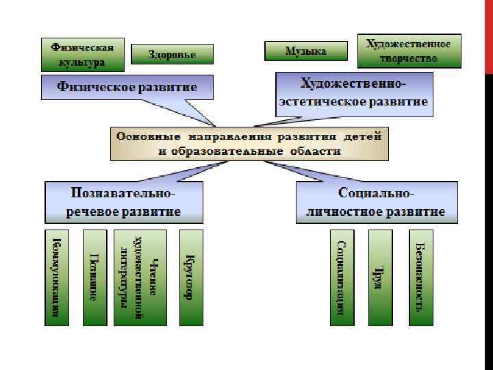 Содержание дошкольного образования представляет собой совокупность 10 -ти образовательных областей: - Физическая культура; Здоровье; Социализация; Труд; Безопасность; Коммуникация; Познание; Чтение художественной литературы; Музыка Художественное творчество