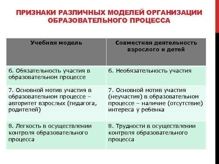 ПРИЗНАКИ РАЗЛИЧНЫХ МОДЕЛЕЙ ОРГАНИЗАЦИИ ОБРАЗОВАТЕЛЬНОГО ПРОЦЕССА Учебная модель Совместная деятельность взрослого и детей 6. Обязательность участия в образовательном процессе 6. Необязательность участия 7. Основной мотив участия в образовательном процессе – авторитет взрослых (педагога, родителей) 7. Основной мотив участия (неучастия) в образовательном процессе – наличие (отсутствие) интереса у ребенка 8. Легкость в осуществлении контроля образовательного процесса 8. Трудности в осуществлении контроля образовательного процесса