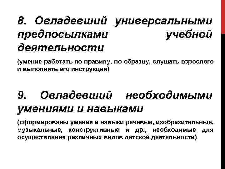 8. Овладевший универсальными предпосылками учебной деятельности (умение работать по правилу, по образцу, слушать взрослого и выполнять его инструкции) 9. Овладевший необходимыми умениями и навыками (сформированы умения и навыки речевые, изобразительные, музыкальные, конструктивные и др. , необходимые для осуществления различных видов детской деятельности)