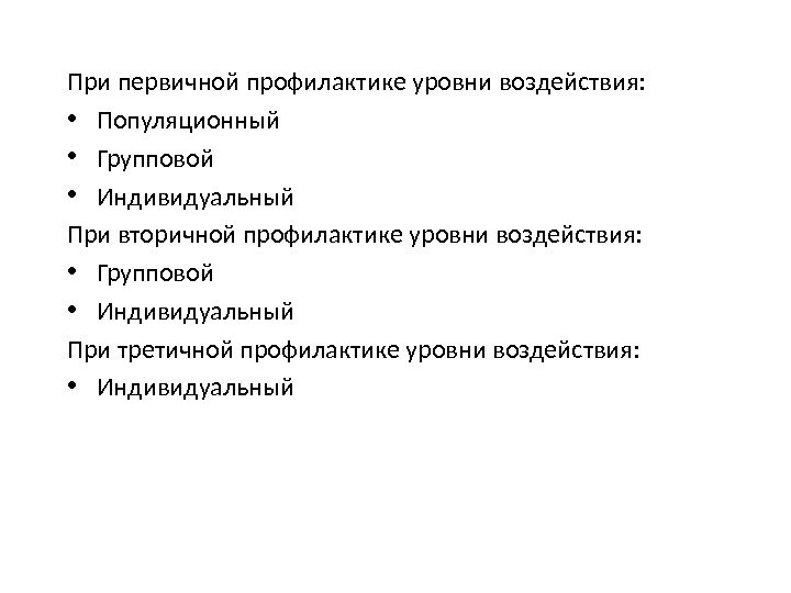 При первичной профилактике уровни воздействия: • Популяционный • Групповой • Индивидуальный При вторичной профилактике уровни воздействия: • Групповой • Индивидуальный При третичной профилактике уровни воздействия: • Индивидуальный
