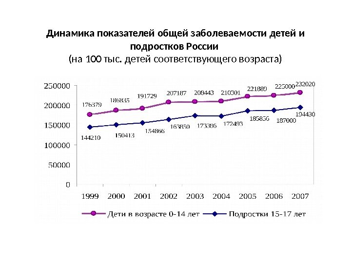 Динамика показателей общей заболеваемости детей и подростков России (на 100 тыс. детей соответствующего возраста)