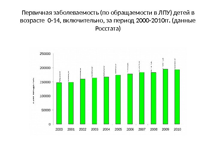 Первичная заболеваемость (по обращаемости в ЛПУ) детей в возрасте 0 -14, включительно, за период 2000 -2010 гг. (данные Росстата)