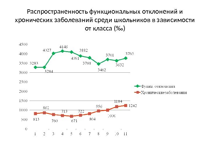 Распространенность функциональных отклонений и хронических заболеваний среди старших подростков (15 -17 лет) — учащихся 9 -11 классов московских школ с 1988 -1989 учебного года по 2014 -2015 учебный год Распространенность функциональных отклонений (‰) Распространенность хронических заболеваний (‰)