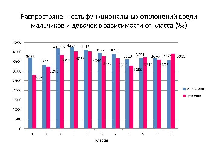 Распространенность функциональных отклонений среди мальчиков и девочек в зависимости от класса (‰)