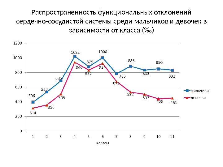 Распространенность функциональных отклонений сердечно-сосудистой системы среди мальчиков и девочек в зависимости от класса (‰)