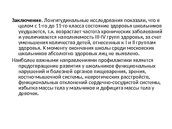 Заключение. Лонгитудинальные исследования показали, что в целом с 1 -го до 11 -го класса состояние здоровья школьников ухудшается, т. к. возрастает частота хронических заболеваний и увеличивается наполняемость III — IV групп здоровья, за счет уменьшения количества детей, отнесенных к I и II группам здоровья. К моменту окончания школы среди московских школьников абсолютно здоровых лиц не выявлено. Наиболее важными направлениями профилактики является предотвращение развития у школьников функциональных нарушений и болезней органов пищеварения, зрения, костно-мышечной системы, невротических расстройств, функциональных отклонений сердечно-сосудистой системы, избытка массы тела у мальчиков и дефицита массы тела у девочек.