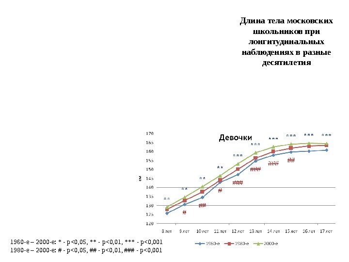 Длина тела московских школьников при лонгитудинальных наблюдениях в разные десятилетия 1960 -е – 2000 -е: * — p <0, 05, ** — p <0, 01, *** — p <0, 001 1980 -е – 2000 -е: # — p <0, 05, ## — p <0, 01, ### — p <0,
