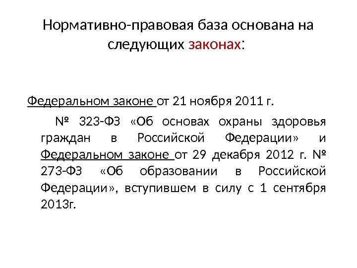 Нормативно-правовая база основана на следующих законах : Федеральном законе от 21 ноября 2011 г. № 323 -ФЗ «Об основах охраны здоровья граждан в Российской Федерации» и Федеральном законе от 29 декабря 2012 г. № 273 -ФЗ «Об образовании в Российской Федерации» , вступившем в силу с 1 сентября 2013 г.