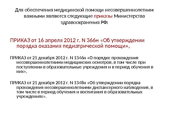 Для обеспечения медицинской помощи несовершеннолетним важными являются следующие приказы Министерства здравоохранения РФ: ПРИКАЗ от 16 апреля 2012 г. N 366 н «Об утверждении порядка оказания педиатрической помощи» , ПРИКАЗ от 21 декабря 2012 г. N 1346 н «О порядке прохождения несовершеннолетними медицинских осмотров, в том числе при поступлении в образовательные учреждения и в период обучения в них» , ПРИКАЗ от 21 декабря 2012 г. N 1348 н «Об утверждении порядка прохождения несовершеннолетними диспансерного наблюдения, в том числе в период обучения и воспитания в образовательных учреждениях» .