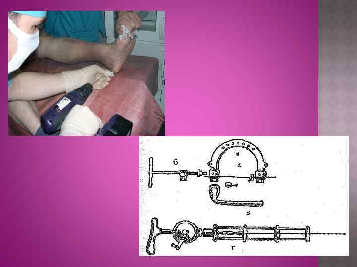 ü ü ü ü ü ИНСТРУМЕНТЫ ДЛЯ СКЕЛЕТНОГО ВЫТЯЖЕНИЯ спица Киршнера скоба Киршнера с натяжителем для спицы или скоба ЦИТО гаечный ключ аппарат ЦИТО (ручная дрель) или электродрель лечебная шина Белера шприц с 0, 5% раствором новокаина и двумя инъекционными иглами кожный антисептик (раствор йодоната) салфетки, смоченные спиртсодержащим антисептиком, для защиты проколотых участков кожи с резиновыми фиксаторами шнур или монолитная леска; груз (набор гирь)