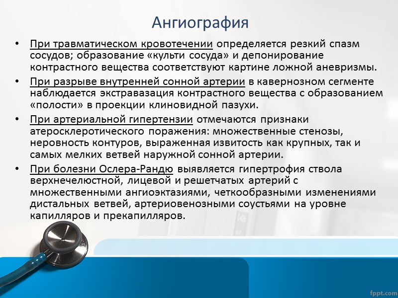 Ангиография При травматическом кровотечении определяется резкий спазм сосудов; образование «культи сосуда» и депонирование контрастного вещества соответствуют картине ложной аневризмы. При разрыве внутренней сонной артерии в кавернозном сегменте наблюдается экстравазация контрастного вещества с образованием «полости» в проекции клиновидной пазухи. При артериальной гипертензии отмечаются признаки атеросклеротического поражения: множественные стенозы, неровность контуров, выраженная извитость как крупных, так и самых мелких ветвей наружной сонной артерии. При болезни Ослера-Рандю выявляется гипертрофия ствола верхнечелюстной, лицевой и решетчатых артерий с множественными ангиоэктазиями, четкообразными изменениями дистальных ветвей, артериовенозными соустьями на уровне капилляров и прекапилляров.