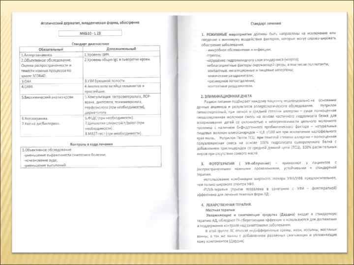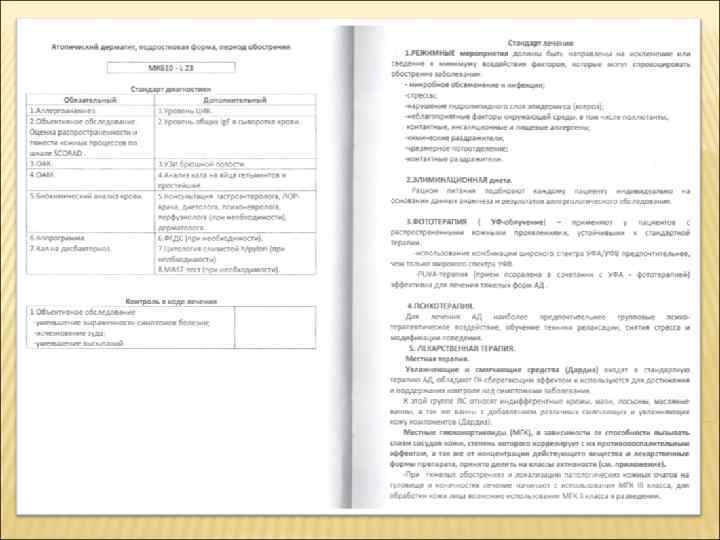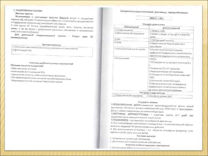 Дифференциальная диагностика токсико-аллергических дерматитов Признак Синдром Стивенса-Джонсона Синдром Лайелла Общее состояние больного Тяжелое Крайне тяжелое Общие симптомы Фебрильная лихорадка, цефалгии, слабость, выделения из носа и глаз Высокая лихорадка, нарушение сознания вплоть до комы, симптомы дегидратации Нет Кардит, нефрит, гепатит, синдром ДВС, ОПН, ДН Поражение внутренних органов Поражение слизистых оболочек Пузырьки, пузыри --эрозии, язвы Изменения на коже Папулы, пузырьки, пузыри, эрозии вокруг естественных отверстий, эритема и геморрагическая сыпь на коже ладоней и подошв На коже туловища пятна, папулы, бляшки --большие пузыри --вскрытие, отслойка эпидермиса --- эрозивные поверхности Симптом Никольского Отрицательный Положительный