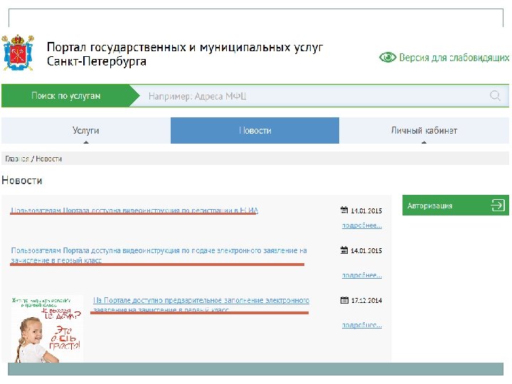 Подача документов для поступления. Особенности подачи заявления через Портал Для направления электронного заявления родителям (законным представителям) необходимо зарегистрироваться и авторизоваться на Портале. После авторизации родитель может войти в «Личный кабинет» . Регистрацию на Портале необходимо выполнить заранее