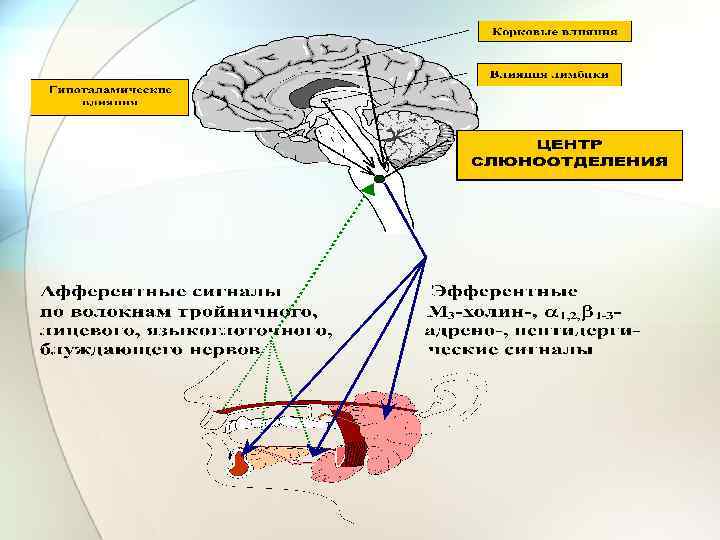 Все слюнные железы входят в состав аппаратов реакции ФУС формирования пищевого комка, адекватного для проглатывания. Аппаратами контроля являются рецепторы слизистой полости рта. Причем, если для жевания ведущими являются механорецепторы, для слюноотделения и слюнообразования ведущие вкусовые хеморецепторы. Афферентные возбуждения по тройничному нерву (V пара), лицевому (VII пара), языкоглоточному (IX пара), блуждающему (X пара) → достигают сенсорных ядер МО – n. tractus salitarius → переключаются на слюноотделительные ядра - n. solivatorius и в составе холинергических (парасимпатических) секреторных и адренергических (симпатических) трофических волокон через соответствующие эфферентные ганглии иннервируют соответствующие слюнные железы: n. salitarius Superior → подъязычная + поднижнечелюстная железы; ü n. solivatorius Inferior → околоушная железа.
