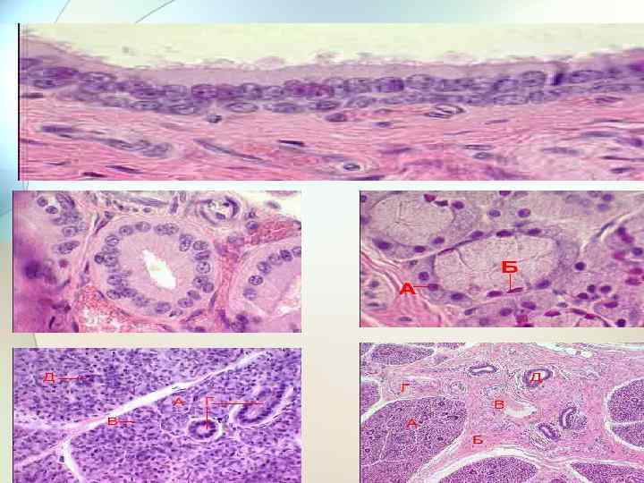 Крупные слюнные железы. Ацинусы и секрет Околоушные – 2 типа клеток: 1 белковые – основные имеют базальный полюс (ядро, гранулярный ретикулум) и апикальный (секреторные гранулы с Поднижнечелюстные – 3 типа клеток: 1. белковые – основные до 80 % - имеют базальный полюс (много РНК) и апикальный полюс (серо-мукозный или серозный секрет) 2. смешанные белково-слизистые; белковым содержимым: αамилаза, ДНКаза); 3. миоэпителиальные клетки (и рыхлая соединительная ткань с малым 2 -миоэпителиальные клетки. количеством коллагена). Секрет белковый. Стенонов проток. Секрет смешанный. Вартонов проток. Подъязычные - 4 типа клеток: 1. белковые; 2. слизистые клетки; 3. смешанные – основные - серозные и слизистые клетки (содержащие нейтральные и кислые мукополисахариды); 4. наружные слизистые миоэпителиальные клетки. Секрет смешанный