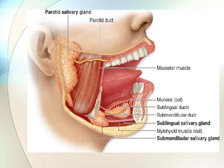 Пищеварение в полости рта. Основа пищеварительного процесса в полости рта - жевание , в результате которого формируется адекватный для проглатывания пищевой комок (ПК). К аппаратам реакции ФУС, которая необходима для достижения данного результата, помимо жевательного аппарата, формирующего моторный компонент, относится сенсорный компонент, а также : • слюнные железы, обеспечивающие секреторный компонент, • сердечно-сосудистая система (микроциркуляция, ультрациркуляция), • дыхательная система, • выделительная система (экскреция), • поведенческие реакции. - консистенция ПК - степень ослизнения Деятельность слюнных желез вместе с - степень увлажнения жевательным аппаратом необходима для - температура обеспечения параметров ПК, - локализация в санкционирующих следующий за жеванием дистальных отделах процесс глотания. полости рта Эти процессы происходят в начальном отделе пищеварительного конвейера – полости рта, ее внутренней среде.