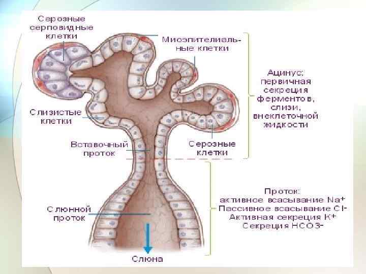 Секреция слюны. Секреторный цикл. • Секреторный цикл включает 5 фаз: 1. Поступление исходных веществ из крови в клетку через базальную мембрану: неорганические вещества, вода, низкомолекулярные органические вещества, аминокислоты, моносахара, жирные кислоты. 2. Секреция первичного продукта на рибосомах мембран ЭПР: в процессе синтеза белки перемещаются внутрь каналов ЭПР, где подвергаются гликозилированию, метилированию, ацетилированию. 3. Созревание первичного продукта: в комплексе Гольджи путем слияния пузырьков комплекса Гольджи с цистернами ЭПР. 4. Накопление секрета в вакуолях и превращение в гранулы зимогена, окруженные липопротеидной оболочкой. 5. Дегрануляция – отделение гранул от цистерн ЭПР, перемещение их к комплексу Гольджи, содержимое гранул переходит в цитозоль, выход секрета из клетки через мембрану апикального полюса - экзоцитоз. (белок кальмодулин, ионы Са 2+, ц-АМФ). NB! Секреторный цикл – это последовательно повторяющиеся изменения гландулоцитов, связанные с синтезом, выделением секрета и восстановлением клеточных органелл.