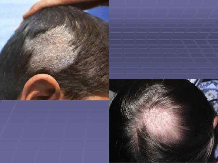 Поверхностная трихофития Обычно болеют дети. Инфекция при прямом контакте или предметы. Очень заразное. На волосистой части головы – много рассеянных мелких и средних (от горошины до вишни) проплешин и серовато-белых чешуек, Волосы - и обломанные и сохранившиеся.