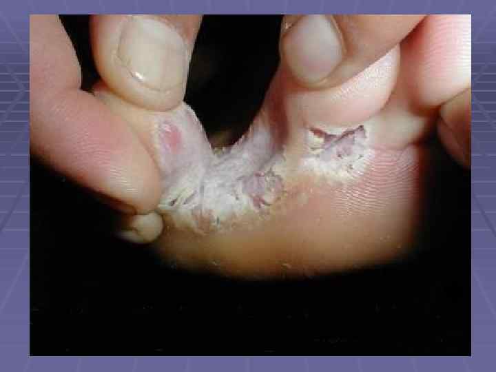 Межпальцевая дерматофития стоп Межпальцевые пространства сухие, шелушение, кожа трескается, белая, мацерированная и влажная. Интенсивный зуд, особенно при снятии носок. Присоединяется вторичная инфекция.