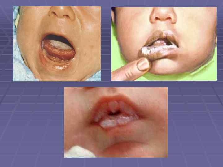 Дрожжевой стоматит (молочница) Белый налет на различных участках слизистой рта, языке (глоссит). Вид створоженного молока, легко снимаются тампоном. Под ними - ярко-красная отечная слизистая или кровоточащая эрозия. Может развиться кандидоз углов рта (дрожжевая заеда).