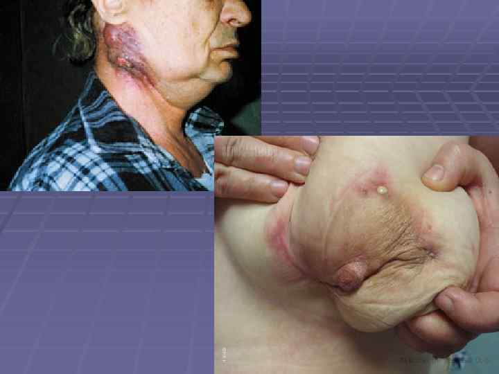 Актиномикоз Заболевание вызывают актиномицеты. На коже - слегка болезненные инфильтраты синюшно-красного цвета. ↓ Они размягчаются, вскрываются ↓ Гнойные свищи. Лечение – системными противогрибковыми препаратами, антибиотиками, инфузионная терапия, плазмаферез.