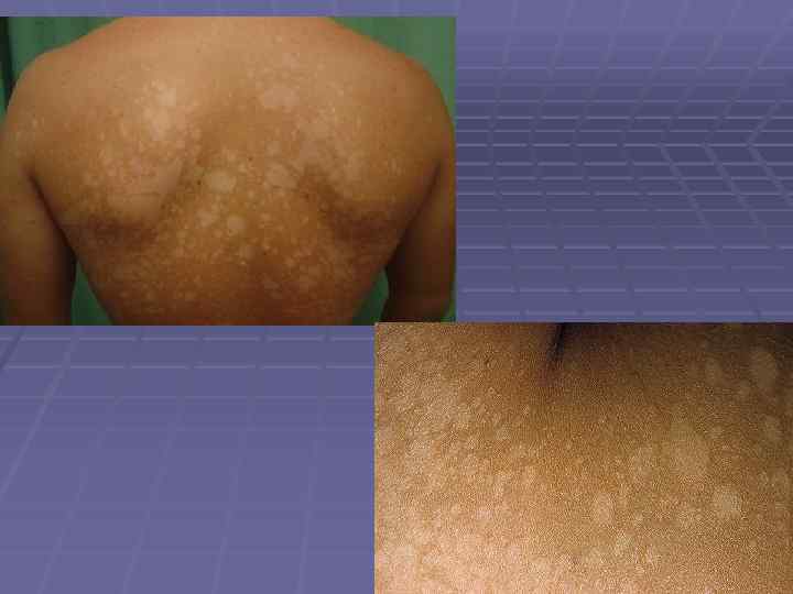 Мелкие пятна коричневого цвета ↓ увеличиваются ↓ сливаются ↓ крупные очаги с едва заметным шелушением. Заболевание длится годами. В месте очагов кожа не загорает.
