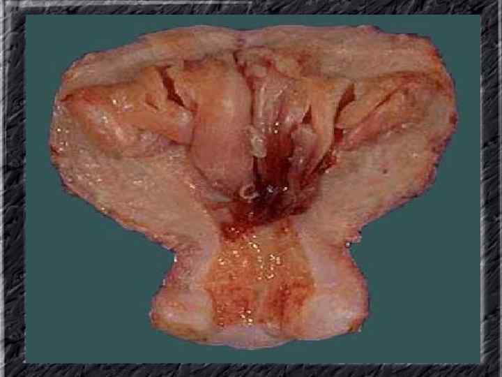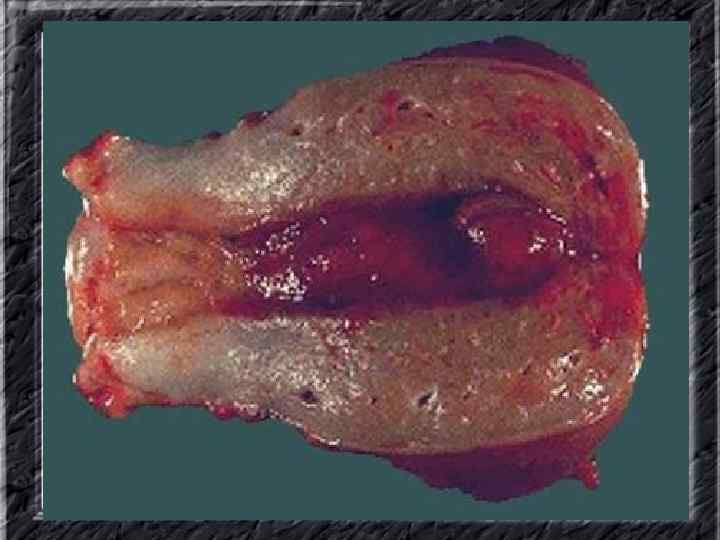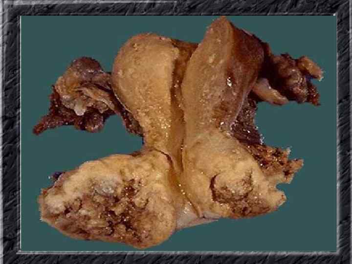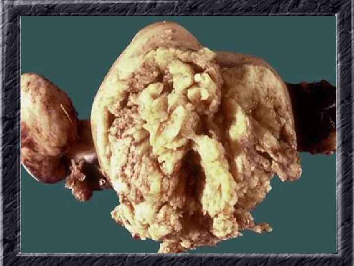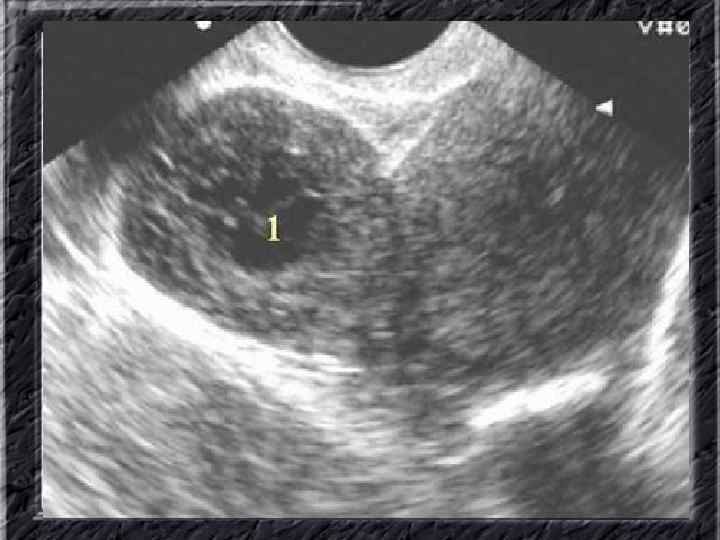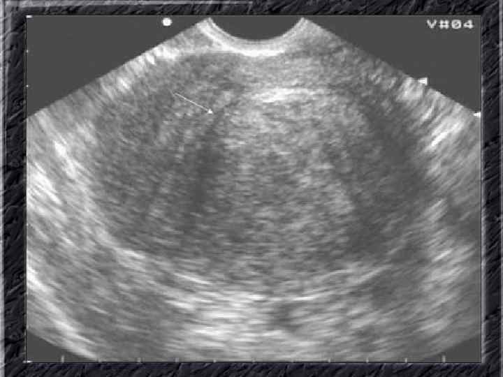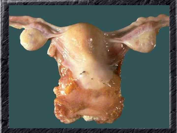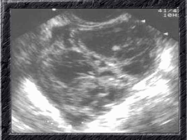 Названия слайдов: • • • Слайд 31. Аденокарцинома эндометрия: образование неправильной формы в дне не увеличенной матки; макропрепарат. Слайд 32. Аденокарцинома эндометрия: бесформенная масса белой опухоли видна по всей поверхности эндометрия матки, вскрытой по передней поверхности, шейка — внизу; макропрепарат. Слайд 33. Нормальная ультразвуковая картина матки и яичников. Слайд 34. Лапароскопия: неизмененные яичники. Слайд 35. Лапароскопия: фолликул на поверхности яичника. Слайд 36. Ультрасонография: жидкостное образование (фолликулярная киста) в параметральной области, однородное, с четкими ровными контурами, кверху и сбоку от кисты определяется ткань неизмененного яичника. Слайд 37. Лапароскопия: фолликулярная киста яичника. Слайд 38. Ультрасонография: киста желтого тела с диффузно неоднородным содержимым средней эхоплотности Слайд 39. Большая эндометриоидная шоколадная киста яичника; макропрепарат. Слайд 40. Ультрасонография: гиперэхогенное содержимое эндометриоидной кисты яичника.