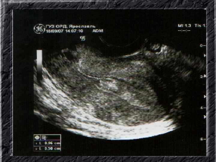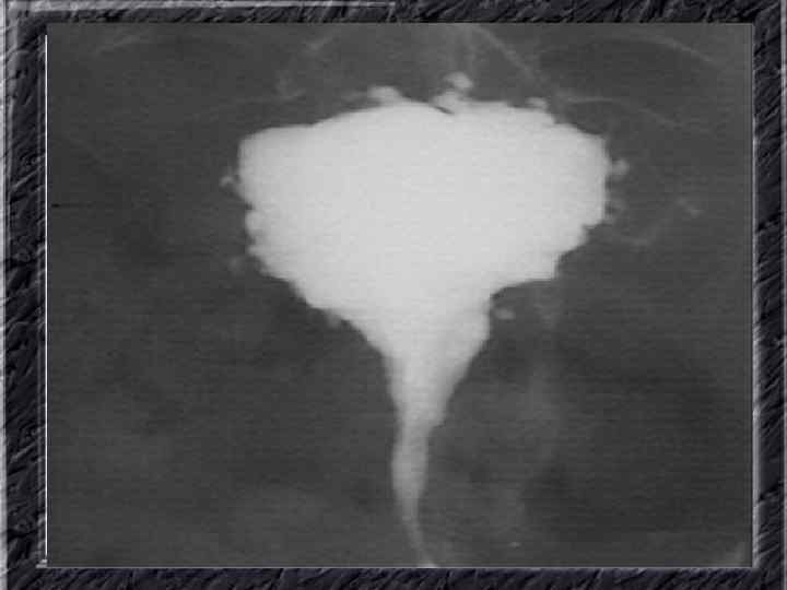 Названия слайдов: • • • Слайд 11. Гиперплазия эндометрия: железистый полип с очагами геморрагий; макропрепарат. Слайд 12. Ультрасонография: однородный эндометрий средней плотности с четкими ровными контурами при неактивной форме железистой гиперплазии эндометрия. Слайд 13. Ультрасонография: гипоэхогенная зона округлой формы в эхоизображении эндометрия — железистый полип. Слайд 14. Ультрасонография: железистый полип эндометрия в виде эхонегативного образования. Слайд 15. Гистерография: характерные изменения контуров полости матки при железистой гиперплазии эндометрия. Слайд 16. Гистерография: изменение формы и зубчатость контуров полости матки при эндометриозе. Слайд 17. Гистерография: изменение формы и зубчатость контуров полости матки при эндометриозе. Слайд 18. Гистерография: направленные перпендикулярно к контурам полости матки контрастированные канальцы. Слайд 19. Гистерография: затек рентгеноконтрастного вещества в правом углу матки при эндометриозе.
