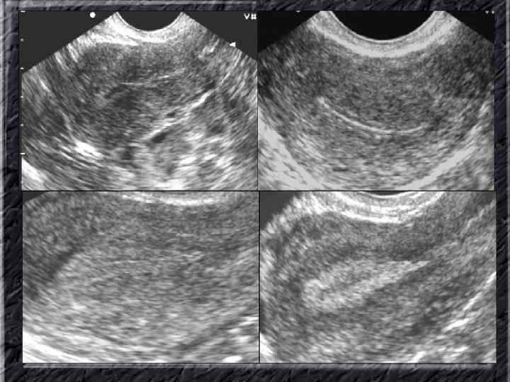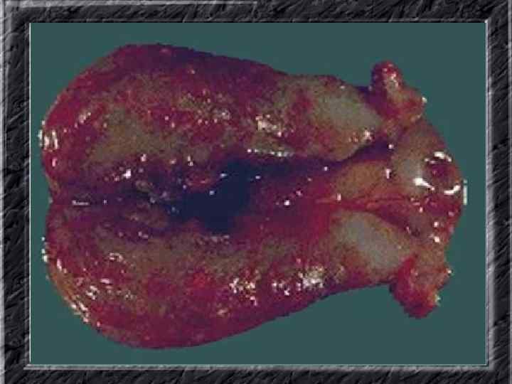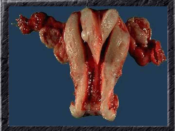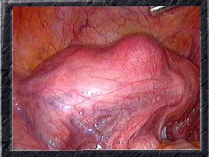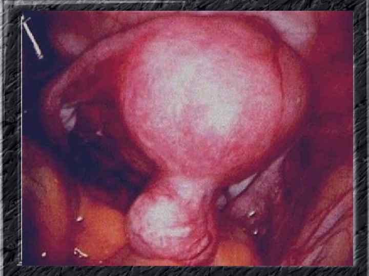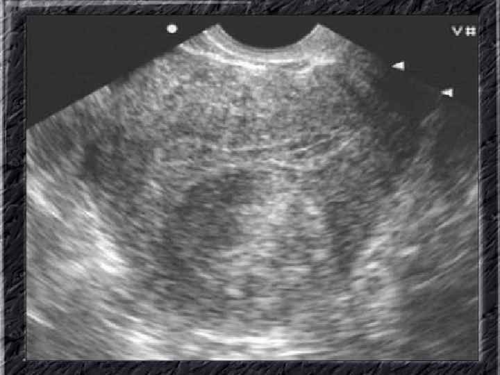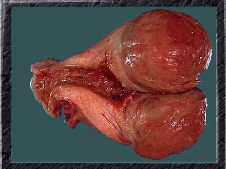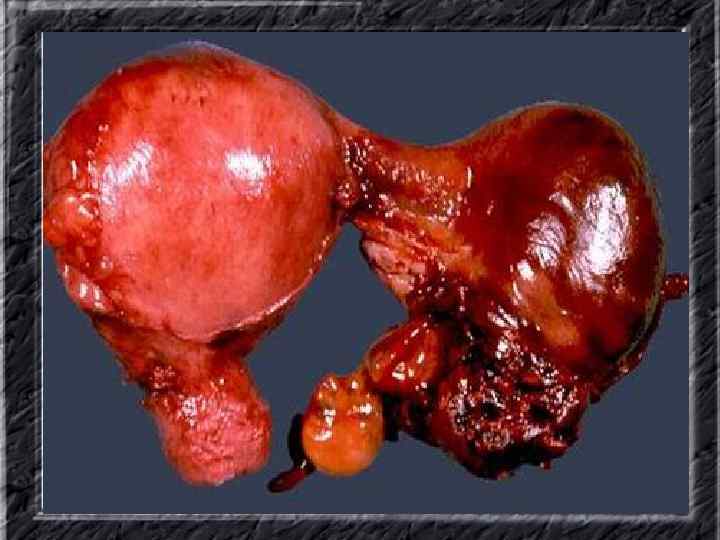 Названия слайдов: • • • Слайд 20. Ультрасонография: диффузная эхонеоднородность миометрия при внутреннем эндометриозе. Слайд 21. Эндометриоз матки: Пять маленьких очажков эндометриоза красно-коричневого цвета по задней поверхности матки; макропрепарат. Слайд 22. Множественная миома матки: видны субсерозные, субмукозные и интрамуральные узлы; макропрепарат. Слайд 23. Большая миома матки, подвергшаяся дегенеративным изменениям ( «красная дегенерация» ); макропрепарат. Слайд 24. Ультрасонография: интрамуральный узел фибромиомы, деформирующий контуры органа. Слайд 25. Ультрасонография: интрамуральный узел фибромиомы, деформирующий полость матки и смещающий эндометрий книзу. Слайд 26. Ультрасонография: субсерозный узел фибромиомы матки с эхопризнаками нарушения питания. Слайд 27. Лапароскопия: субсерозная фибромиома матки. Слайд 28. Лапароскопия: выраженный сосудистый рисунок на поверхности субсерозной фибромиомы матки. Слайд 29. Лапароскопия: выраженный сосудистый рисунок на поверхности субсерозной фибромиомы матки. Слайд 30. Большая цервикальная плоскоклеточная карцинома, которая простирается до влагалища; макропрепарат.
