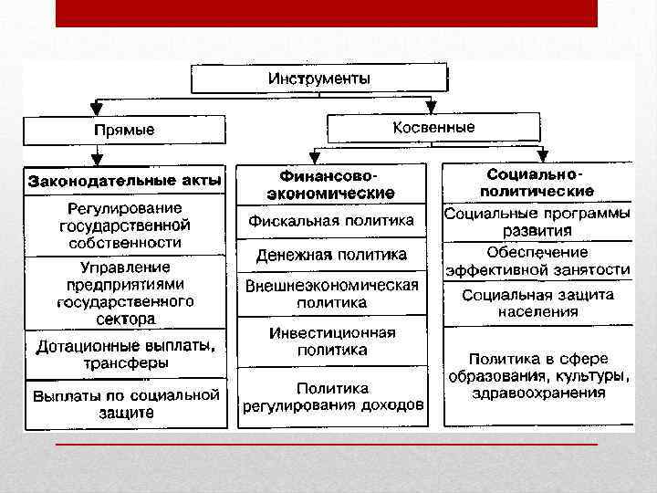 • Бюджетно-налоговая (фискальная) политика — деятельность государства в области налогообложения, регулирования государственных расходов и государственного бюджета. Направлена на обеспечение стабильного развития экономики, предотвращения инфляции и обеспечение занятости населения. • Денежно-кредитная (монетарная) политика — контроль над денежной массой в экономике. Её цель — поддержка стабильного развития экономики. Механизмы государственного регулирования рыночной экономики