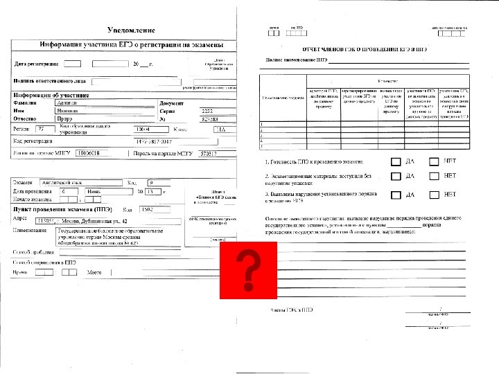Действия работников при проведении ЕГЭ в ППЭ Допуск участников ЕГЭ в ППЭ осуществляется при наличии у них документов, удостоверяющих их личность, и при наличии их в списках распределения в данный ППЭ Каждому участнику ЕГЭ также выдается форма для направления в ГЭК замечаний о нарушениях процедуры проведения ГИА По завершении экзамена члены ГЭК составляют отчет о проведении ЕГЭ в ППЭ, который в тот же день передается в ГЭК рма? Фо