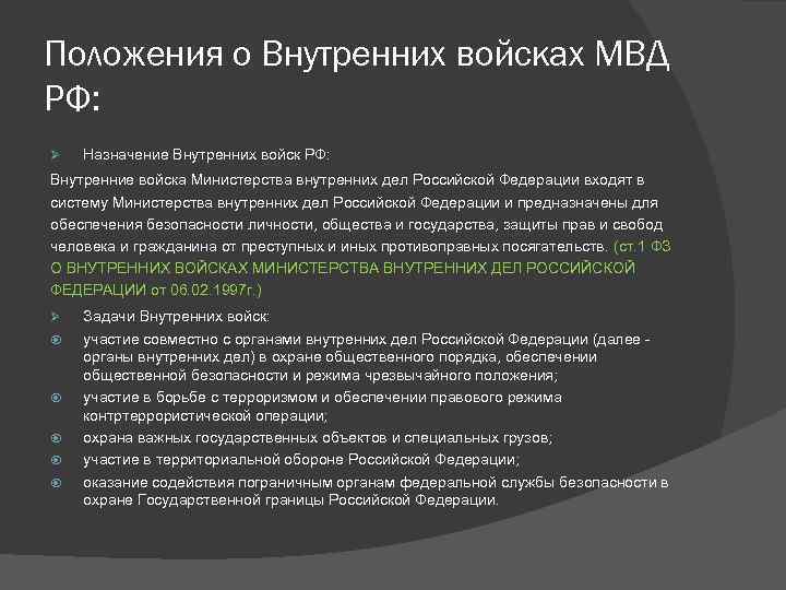 Положения о Внутренних войсках МВД РФ: Ø Назначение Внутренних войск РФ: Внутренние войска Министерства внутренних дел Российской Федерации входят в систему Министерства внутренних дел Российской Федерации и предназначены для обеспечения безопасности личности, общества и государства, защиты прав и свобод человека и гражданина от преступных и иных противоправных посягательств. (ст. 1 ФЗ О ВНУТРЕННИХ ВОЙСКАХ МИНИСТЕРСТВА ВНУТРЕННИХ ДЕЛ РОССИЙСКОЙ ФЕДЕРАЦИИ от 06. 02. 1997 г. ) Ø Задачи Внутренних войск: участие совместно с органами внутренних дел Российской Федерации (далее органы внутренних дел) в охране общественного порядка, обеспечении общественной безопасности и режима чрезвычайного положения; участие в борьбе с терроризмом и обеспечении правового режима контртеррористической операции; охрана важных государственных объектов и специальных грузов; участие в территориальной обороне Российской Федерации; оказание содействия пограничным органам федеральной службы безопасности в охране Государственной границы Российской Федерации.