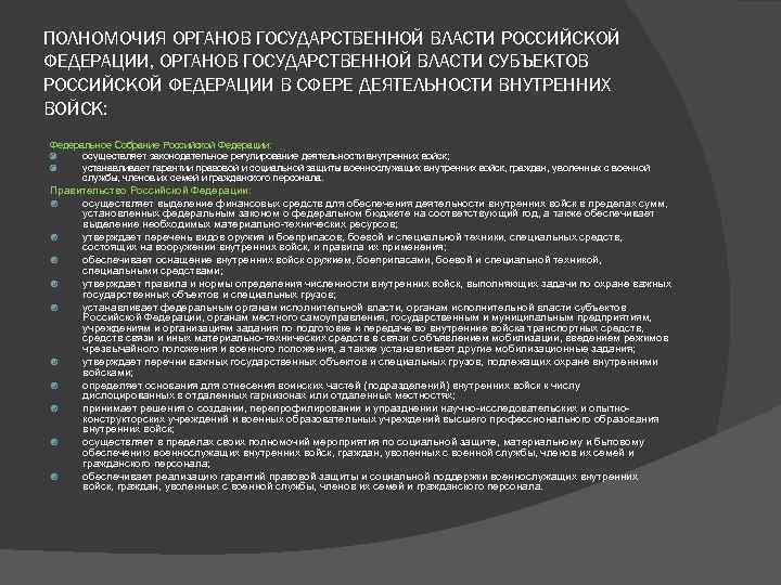 ПОЛНОМОЧИЯ ОРГАНОВ ГОСУДАРСТВЕННОЙ ВЛАСТИ РОССИЙСКОЙ ФЕДЕРАЦИИ, ОРГАНОВ ГОСУДАРСТВЕННОЙ ВЛАСТИ СУБЪЕКТОВ РОССИЙСКОЙ ФЕДЕРАЦИИ В СФЕРЕ ДЕЯТЕЛЬНОСТИ ВНУТРЕННИХ ВОЙСК: Федеральное Собрание Российской Федерации: осуществляет законодательное регулирование деятельности внутренних войск; устанавливает гарантии правовой и социальной защиты военнослужащих внутренних войск, граждан, уволенных с военной службы, членов их семей и гражданского персонала. Правительство Российской Федерации: осуществляет выделение финансовых средств для обеспечения деятельности внутренних войск в пределах сумм, установленных федеральным законом о федеральном бюджете на соответствующий год, а также обеспечивает выделение необходимых материально-технических ресурсов; утверждает перечень видов оружия и боеприпасов, боевой и специальной техники, специальных средств, состоящих на вооружении внутренних войск, и правила их применения; обеспечивает оснащение внутренних войск оружием, боеприпасами, боевой и специальной техникой, специальными средствами; утверждает правила и нормы определения численности внутренних войск, выполняющих задачи по охране важных государственных объектов и специальных грузов; устанавливает федеральным органам исполнительной власти, органам исполнительной власти субъектов Российской Федерации, органам местного самоуправления, государственным и муниципальным предприятиям, учреждениям и организациям задания по подготовке и передаче во внутренние войска транспортных средств, средств связи и иных материально-технических средств в связи с объявлением мобилизации, введением режимов чрезвычайного положения и военного положения, а также устанавливает другие мобилизационные задания; утверждает перечни важных государственных объектов и специальных грузов, подлежащих охране внутренними войсками; определяет основания для отнесения воинских частей (подразделений) внутренних войск к числу дислоцированных в отдаленных гарнизонах или отдаленных местностях; принимает решения о создании, перепрофилировании и упразднении научно-исследовательских и опытноконструкторских учреждений и военных образовательных учреждений высшего профессионального образования внутренних войск; осуществляет в пределах своих полномочий мероприятия по социальной защите, материальному и бытовому обеспечению военнослужащих внутренних войск, граждан, уволенных с военной службы, членов их семей и гражданского персонала; обеспечивает реализацию гарантий правовой защиты и социальной поддержки военнослужащих внутренних войск, граждан, уволенных с военной службы, членов их семей и гражданского персонала.