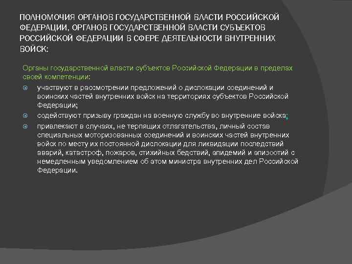 ПОЛНОМОЧИЯ ОРГАНОВ ГОСУДАРСТВЕННОЙ ВЛАСТИ РОССИЙСКОЙ ФЕДЕРАЦИИ, ОРГАНОВ ГОСУДАРСТВЕННОЙ ВЛАСТИ СУБЪЕКТОВ РОССИЙСКОЙ ФЕДЕРАЦИИ В СФЕРЕ ДЕЯТЕЛЬНОСТИ ВНУТРЕННИХ ВОЙСК: Органы государственной власти субъектов Российской Федерации в пределах своей компетенции: участвуют в рассмотрении предложений о дислокации соединений и воинских частей внутренних войск на территориях субъектов Российской Федерации; содействуют призыву граждан на военную службу во внутренние войска; привлекают в случаях, не терпящих отлагательства, личный состав специальных моторизованных соединений и воинских частей внутренних войск по месту их постоянной дислокации для ликвидации последствий аварий, катастроф, пожаров, стихийных бедствий, эпидемий и эпизоотий с немедленным уведомлением об этом министра внутренних дел Российской Федерации.