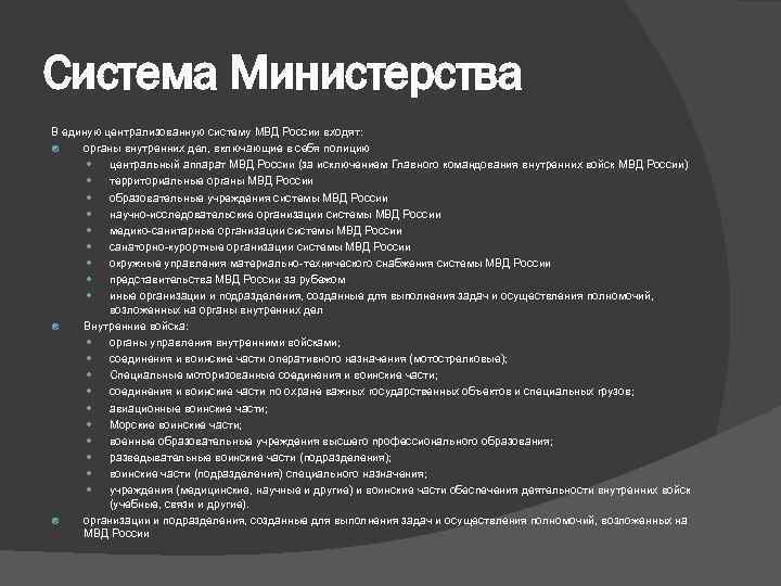 Система Министерства В единую централизованную систему МВД России входят: органы внутренних дел, включающие в себя полицию центральный аппарат МВД России (за исключением Главного командования внутренних войск МВД России) территориальные органы МВД России образовательные учреждения системы МВД России научно-исследовательские организации системы МВД России медико-санитарные организации системы МВД России санаторно-курортные организации системы МВД России окружные управления материально-технического снабжения системы МВД России представительства МВД России за рубежом иные организации и подразделения, созданные для выполнения задач и осуществления полномочий, возложенных на органы внутренних дел Внутренние войска: органы управления внутренними войсками; соединения и воинские части оперативного назначения (мотострелковые); Специальные моторизованные соединения и воинские части; соединения и воинские части по охране важных государственных объектов и специальных грузов; авиационные воинские части; Морские воинские части; военные образовательные учреждения высшего профессионального образования; разведывательные воинские части (подразделения); воинские части (подразделения) специального назначения; учреждения (медицинские, научные и другие) и воинские части обеспечения деятельности внутренних войск (учебные, связи и другие). организации и подразделения, созданные для выполнения задач и осуществления полномочий, возложенных на МВД России